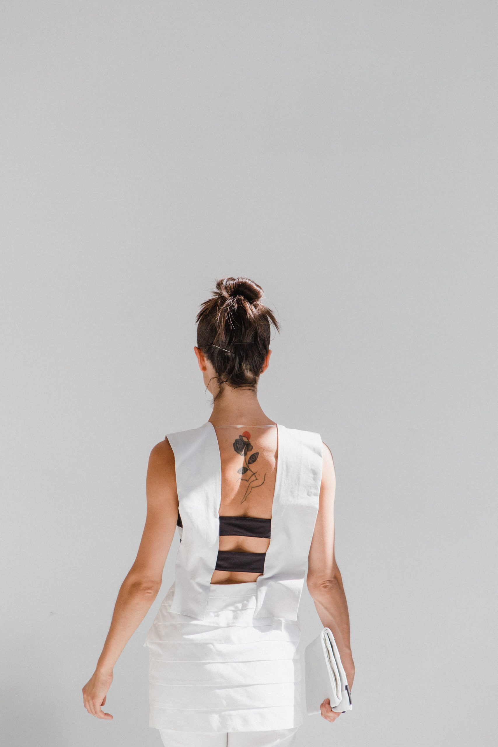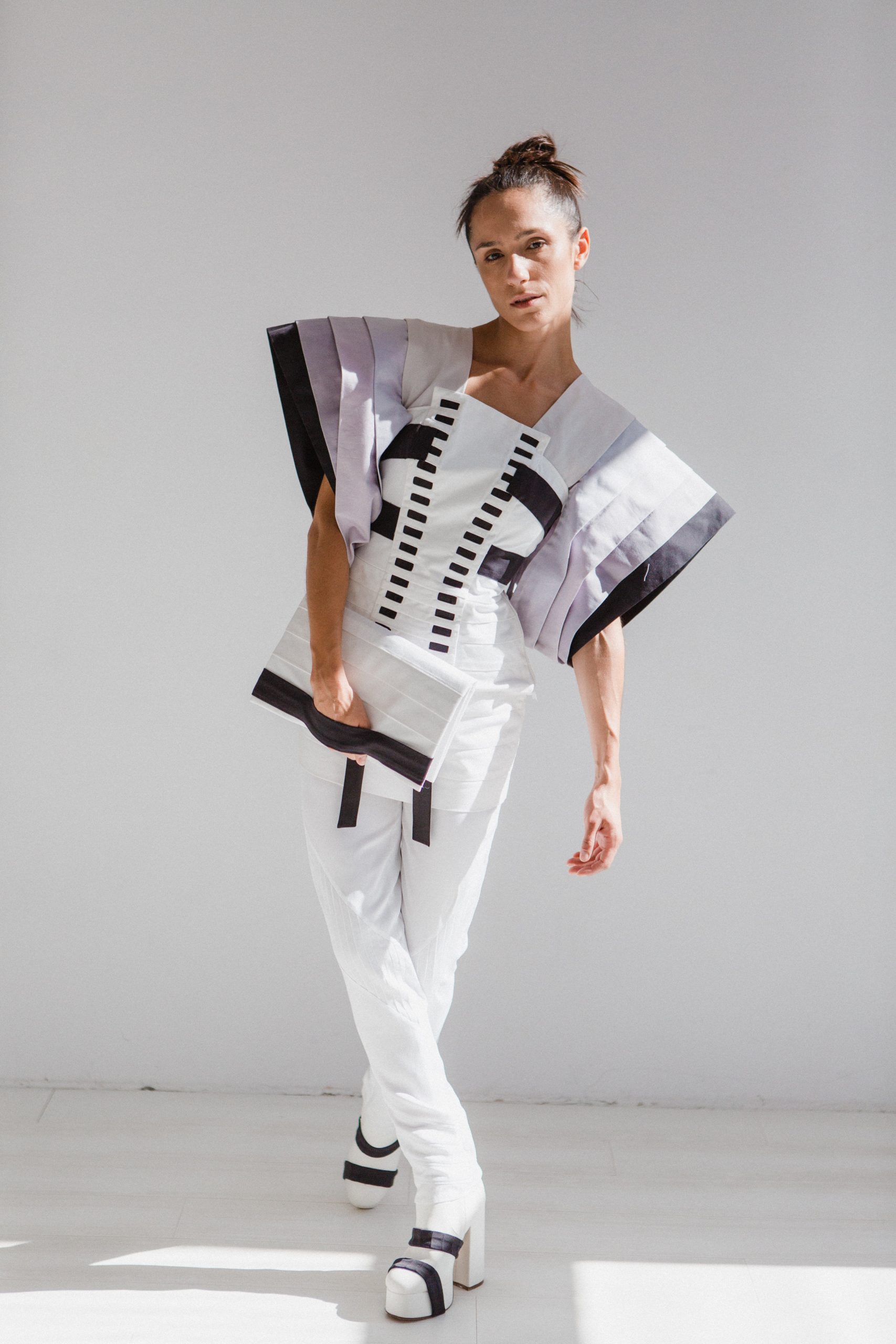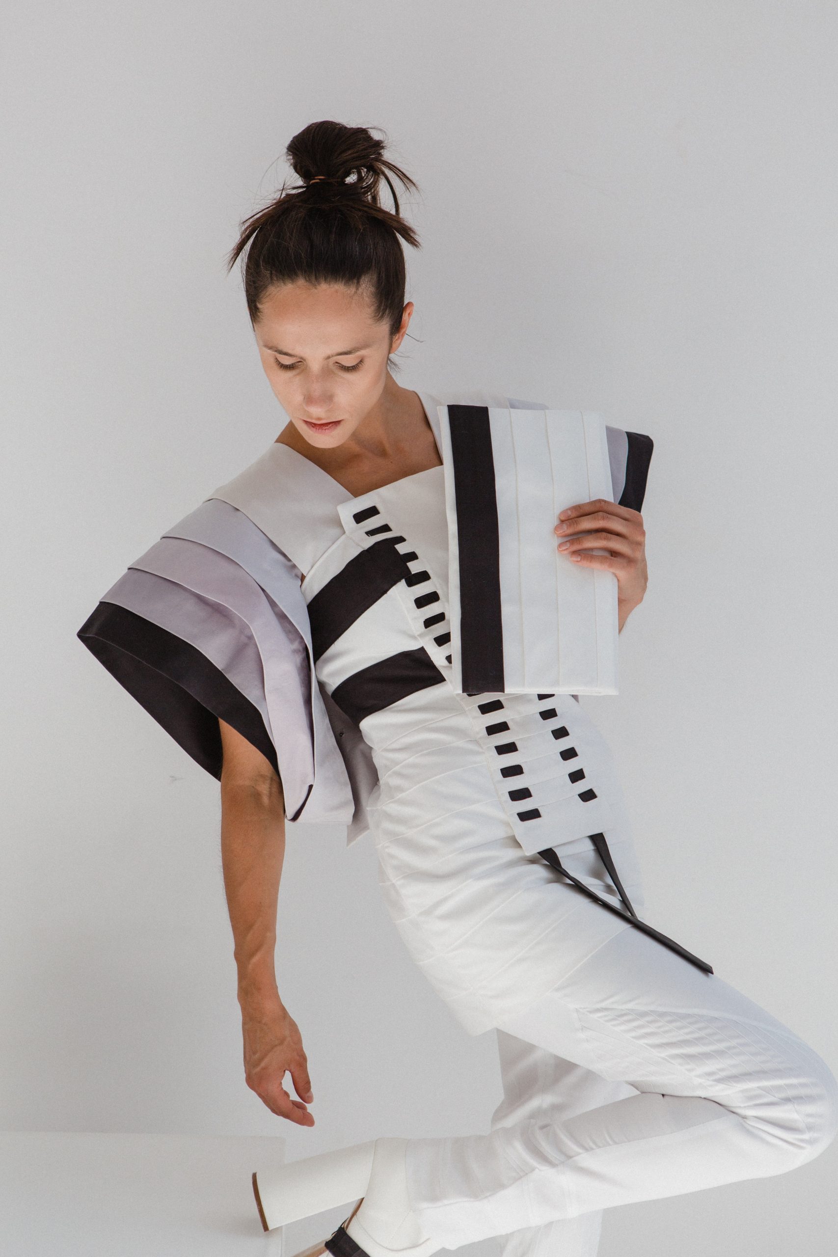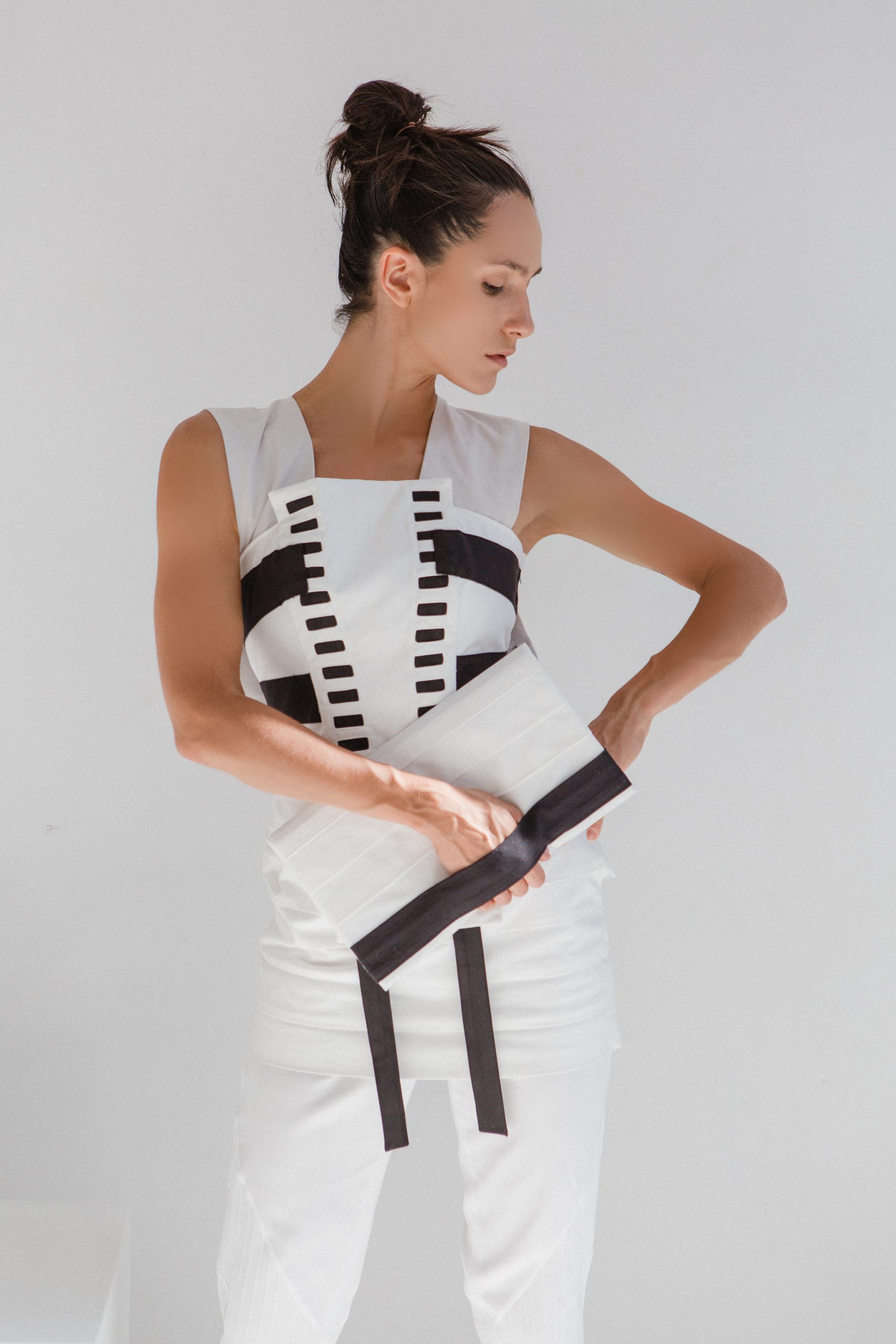 Tunika z odpinanymi ramionami z tkaniny bawełnianej z przeplatanymi satynowymi wstęgami.