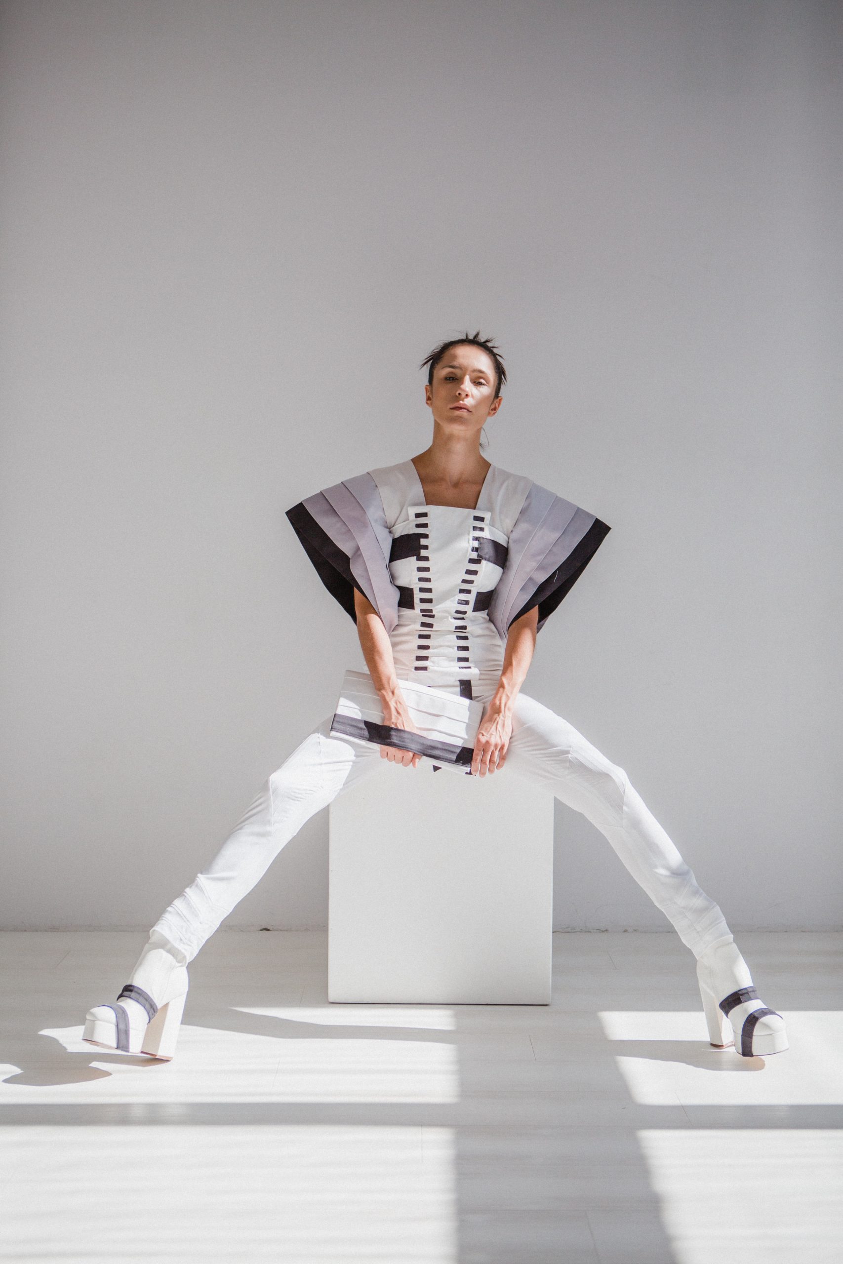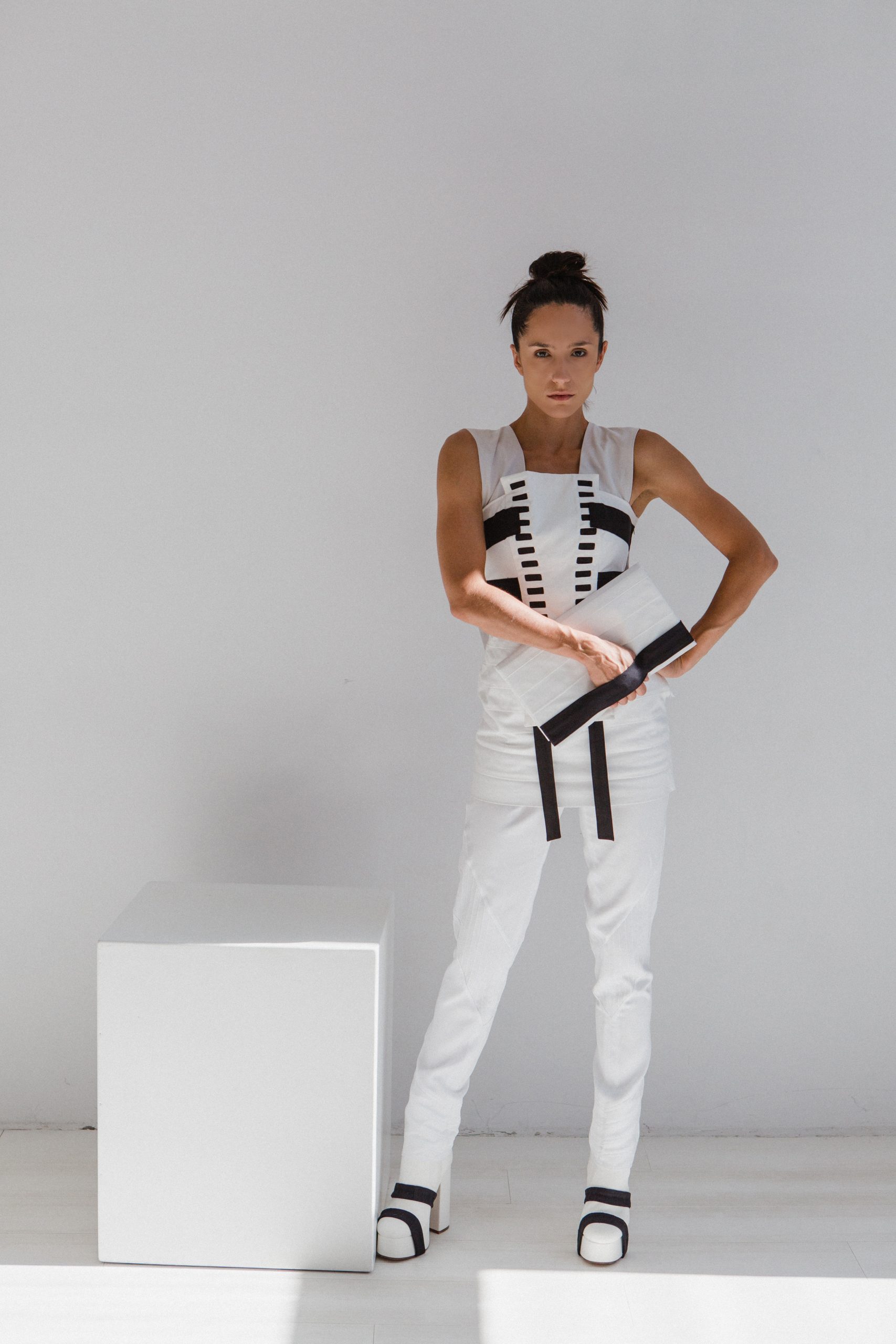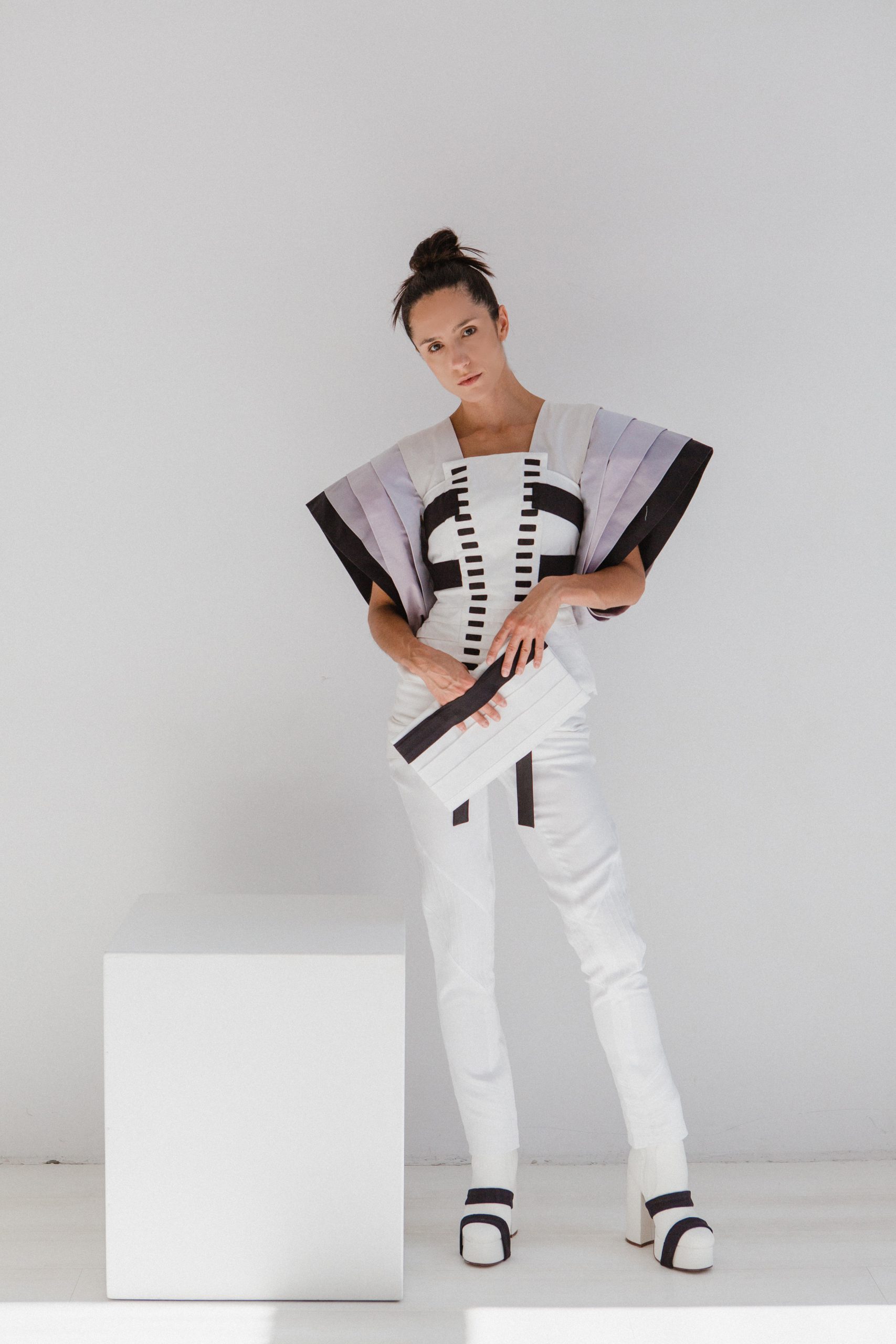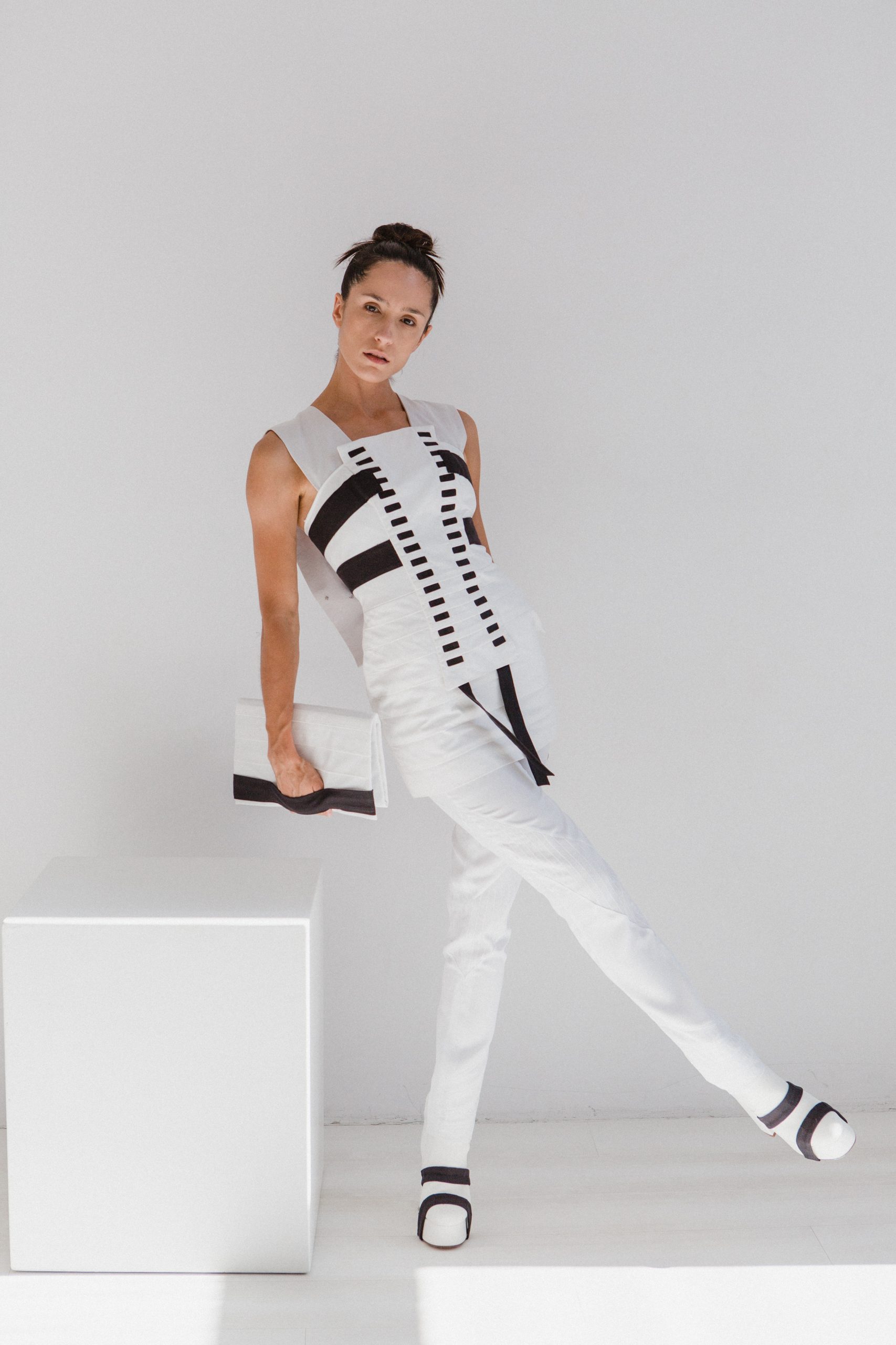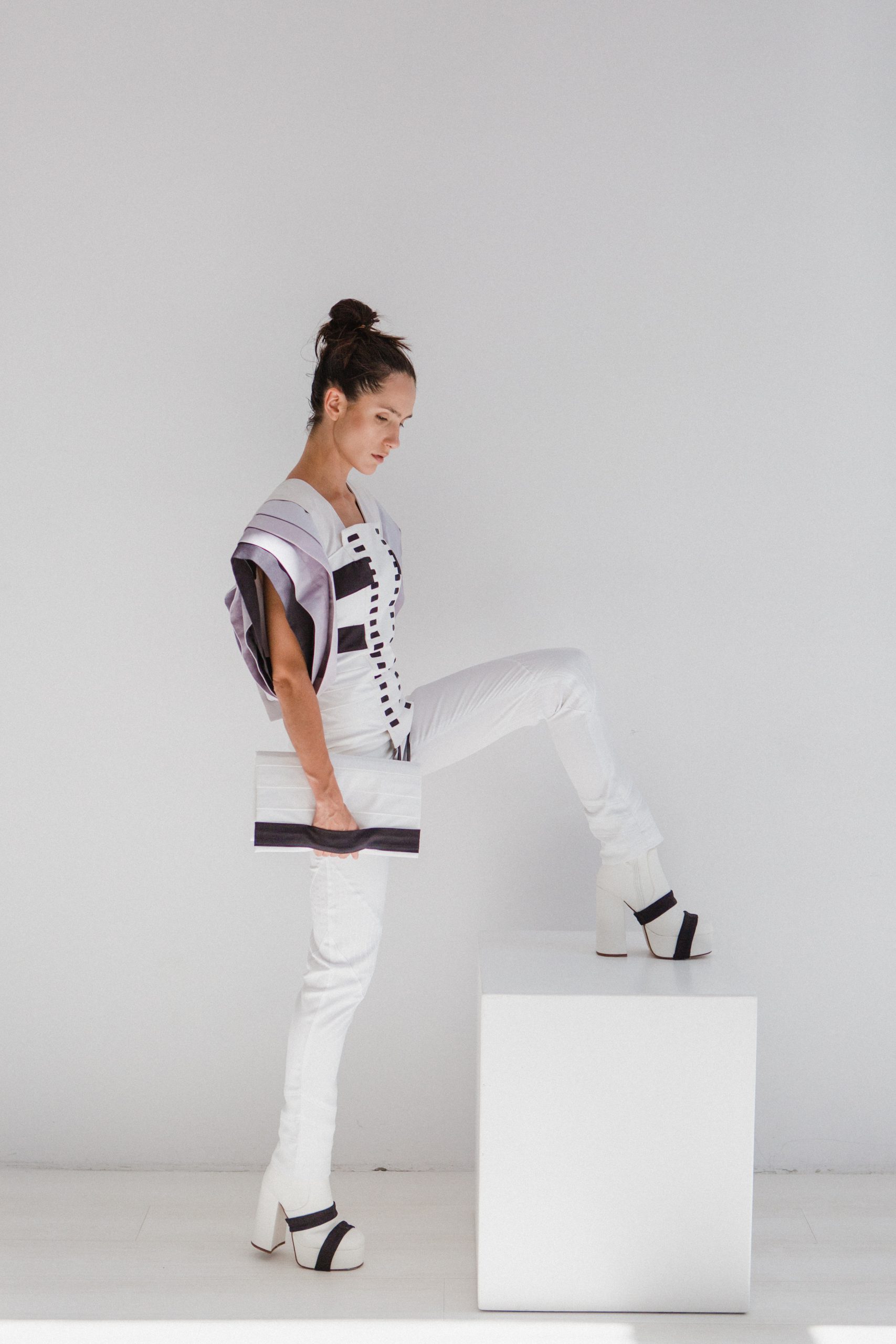 Tunika z odpinanymi ramionami z tkaniny bawełnianej z przeplatanymi satynowymi wstęgami.